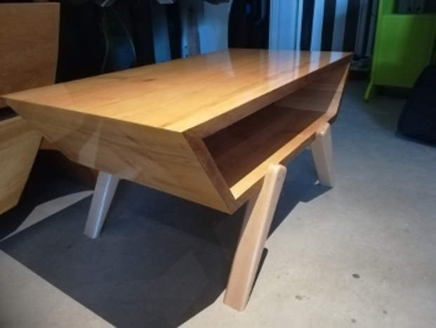 Table de salon Design en merisier et pieds en hêtre, finition vernis vénitien.